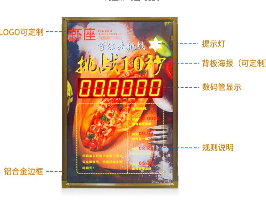 贛鑫抖音10秒計時器-,采用鋁合金邊框,內置蜂鳴器,海報可添加LOGo以及自己店鋪游戲規則。使用壽命長達10W小時。定制咨詢電話18069884716