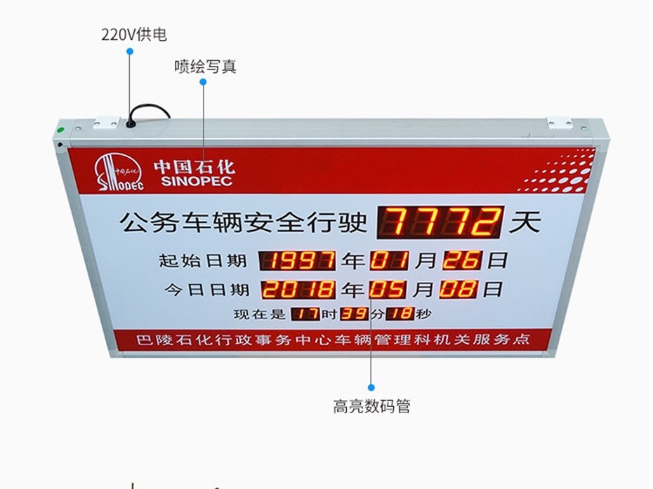 贛鑫中國石化安全天數牌采用鋁合金外框,壁掛式安裝,可自主定制功能顯示。咨詢電話18069884716